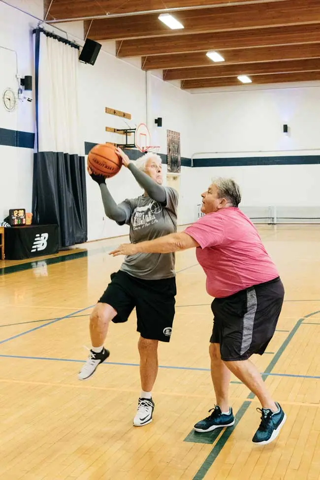 Part of Maine Senior Women’s Basketball, a league of age-bracketed teams for women over 50, the Pioneers both practice and play during their weekly sessions — their games are against one another, played three-on-three and half-court. The team also travels to compete in tournaments against other senior teams: at least one a year in Maine, sometimes others around New England, and at the biennial National Senior Games. At the last NSG, held in New Mexico in 2019, the Pioneers brought home silver, crushing the Connecticut Nutmegs, the Pasadena Cougars, and others, but losing a shoot-out to Tennessee’s Smoky Mountain Hot Shots.