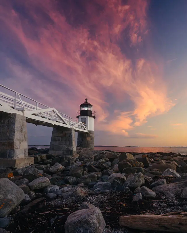 This is one of my favorite locations to witness a beautiful Maine sunset. On this evening, I noticed the wispy clouds overhead lighting up and changing color, and I knew I wanted the puddle of seawater for a reflection. It was low tide, so I walked down into the mud and backed up against an old rock wall to get the shot I envisioned.