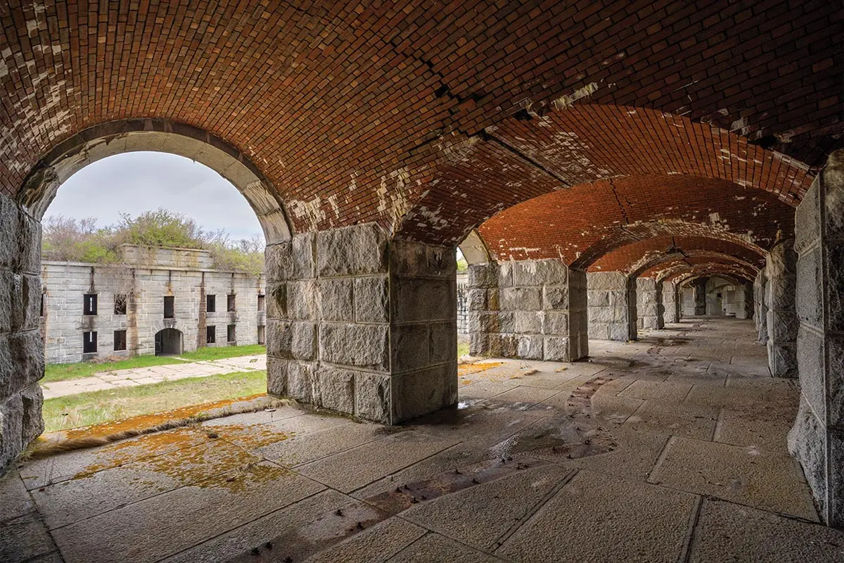 Left: The granite-block casemates of Fort Popham. The 19th-century fort never saw any action from its perch at the mouth of the Kennebec River. During the Civil War, the garrison’s commander was Augustin Thompson, inventor of Moxie soda. Right: Archways at Fort McClary. Just across the Piscataqua River from New Hampshire, on a site that has been variously fortified since the 1600s, Fort McClary bears the name of a New Hampshire native, Andrew McClary, who died in the 1775 Battle of Bunker Hill.