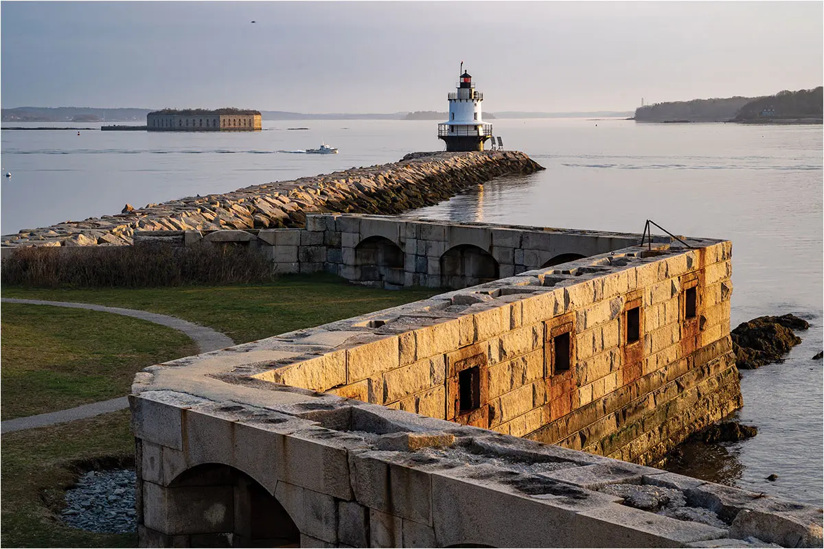 The view from atop Fort Preble takes in Fort Gorges and South Portland’s spark-plug–style Spring Point Ledge Light. During the Civil War, soldiers from the fort chased down and took captive 23 Confederate raiders who had snuck into Portland Harbor and stolen a Union ship. Today, the fort is on the Southern Maine Community College campus.