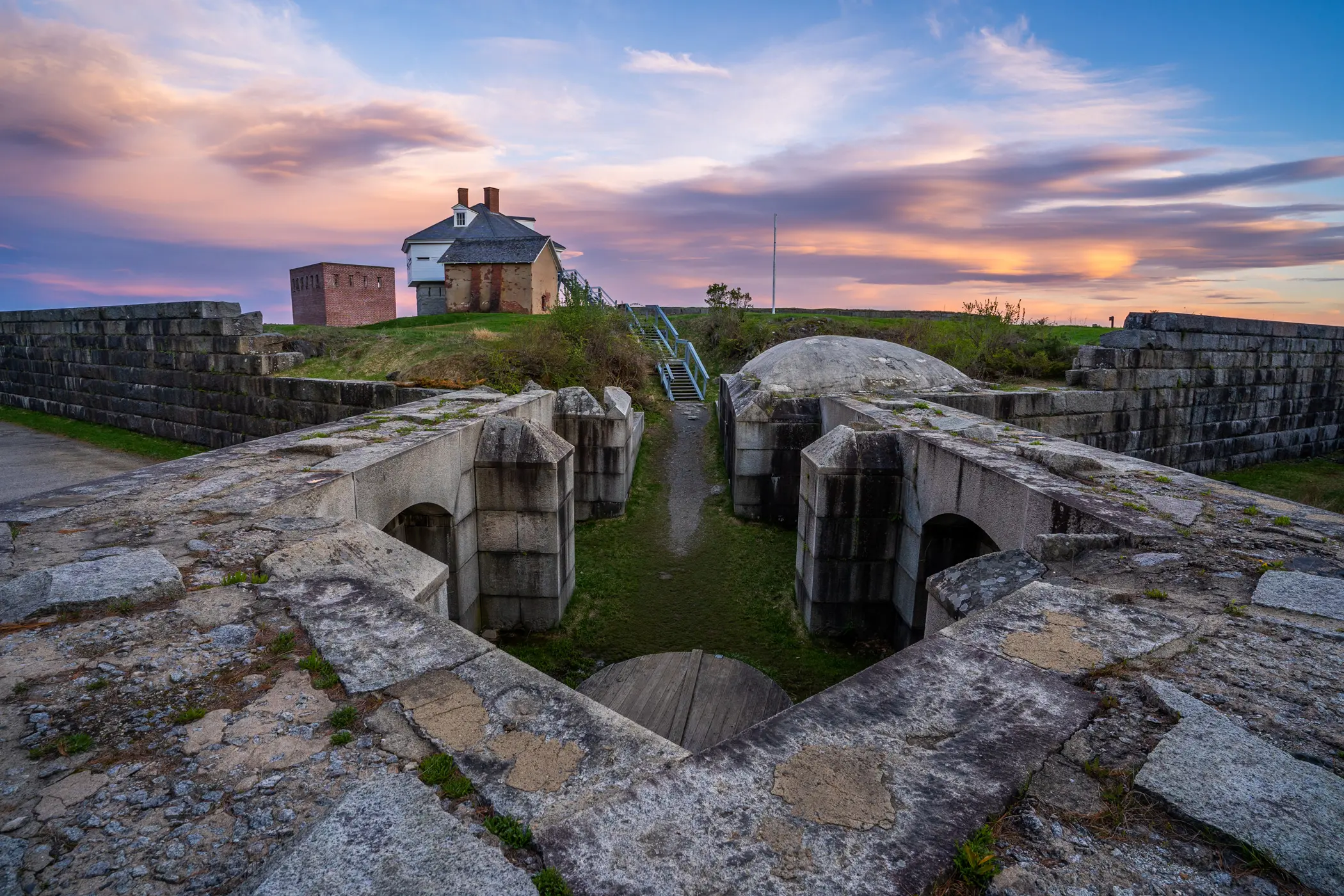 Left: The granite-block casemates of Fort Popham. The 19th-century fort never saw any action from its perch at the mouth of the Kennebec River. During the Civil War, the garrison’s commander was Augustin Thompson, inventor of Moxie soda. Right: Archways at Fort McClary. Just across the Piscataqua River from New Hampshire, on a site that has been variously fortified since the 1600s, Fort McClary bears the name of a New Hampshire native, Andrew McClary, who died in the 1775 Battle of Bunker Hill.