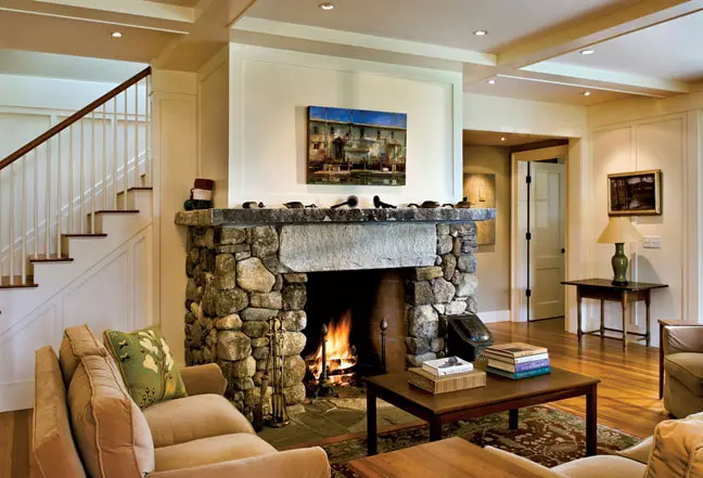 The living room is softly lit with creamy white, wainscoted walls and a fieldstone central fireplace. A four-season porch with bluestone flooring provides a warm space from which to enjoy winter’s fury. In summer, screens allow for a cool ocean breeze.