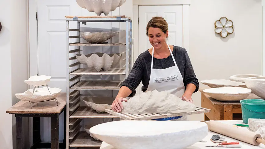 Ceramic artist Alison Evans crafts her organic, mollusk-inspired pieces in an airy studio within her Boothbay Harbor shop.