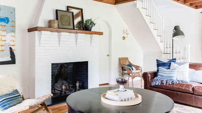 A historic living room sits comfortably between past and present thanks to clean-lined furnishings and fresh coats of white paint