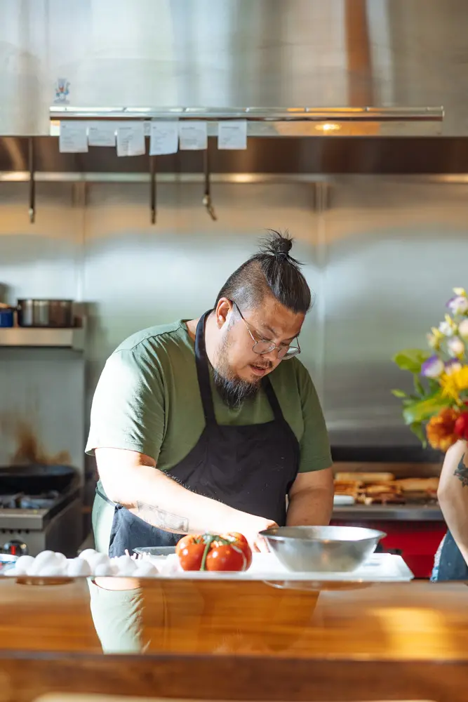 The front patio at Le Mu’s new home; chef Sav Sengsavang; cocktails and Laotian-American fusion from the Le Mu Eats menu. Photos by Branden Pullen.