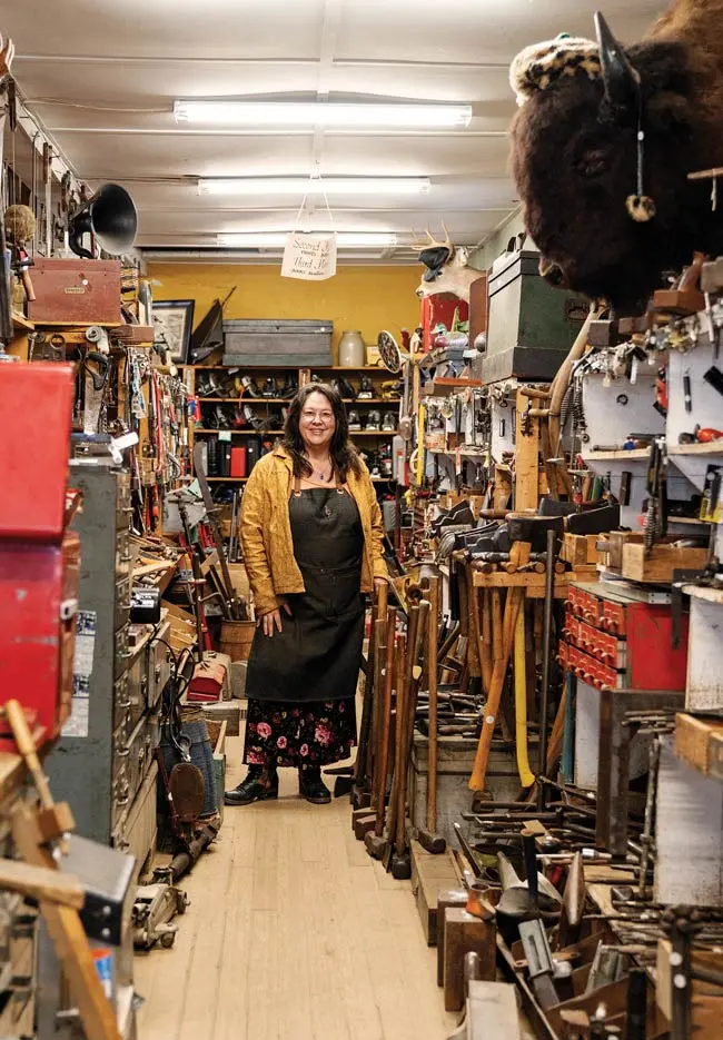 Top right: among the stacks at Ellsworth’s Big Chicken Barn. Surrounding: not far away, 1A Relics is an eye-catching landmark and a jumble of the precious and weird (complete with a creepy Stephen King bookshelf). Photos by Benjamin Williamson.