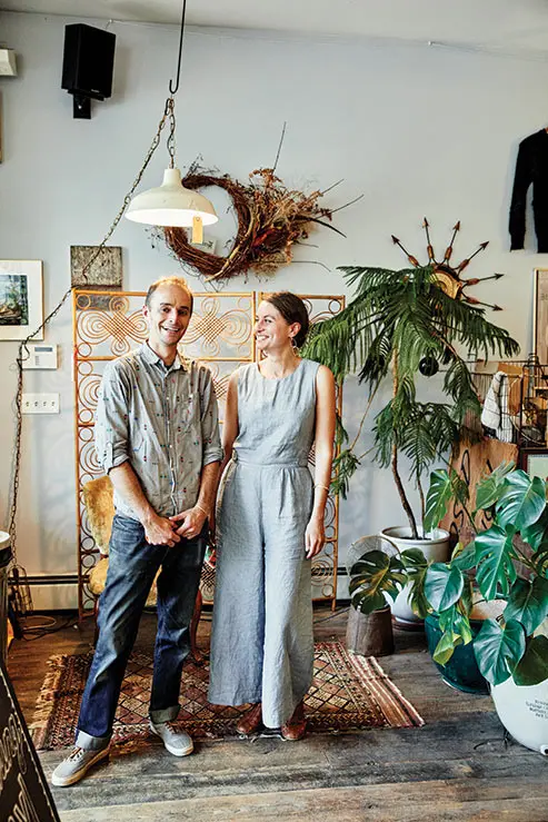 Clockwise from top left: Lexi and Sam Joyall, at The Rusticators Emporium; Paul Cote, with vintage toboggans, at Route 26 Antiques; one of the eclectic displays at Cornish Trading Company. Photos by Dave Dostie, Cait Bourgault, and Danielle Sykes, respectively.