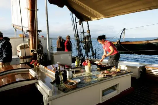 Platters get passed to the mess room below deck. Passengers descend into the snug space, ready to dive into their first meal of the cruise. Swan, 31, and a 2001 graduate of the Culinary Institute of America, settles back on a bench for a chat. But just for a moment. She’s got a lunch of haddock chowder with homemade buttermilk biscuits and spinach salad to prepare.