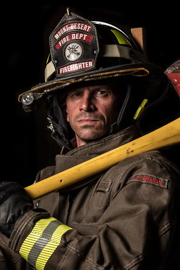 Over the course of several weeks, I made portraits of 43 firefighters. What moved me when I got them in front of my camera was how ordinary they looked — and how exceptional at the same time. Nearly three-quarters of Maine’s fire departments are staffed entirely by volunteer firefighters. They sign up to do things we are genetically wired to run away from. I watched some of them change from their daily-life clothes into their firefighter garb, and the transition seemed to make them all a little taller, tougher, steelier — even the banker, the accountant, and the innkeeper.